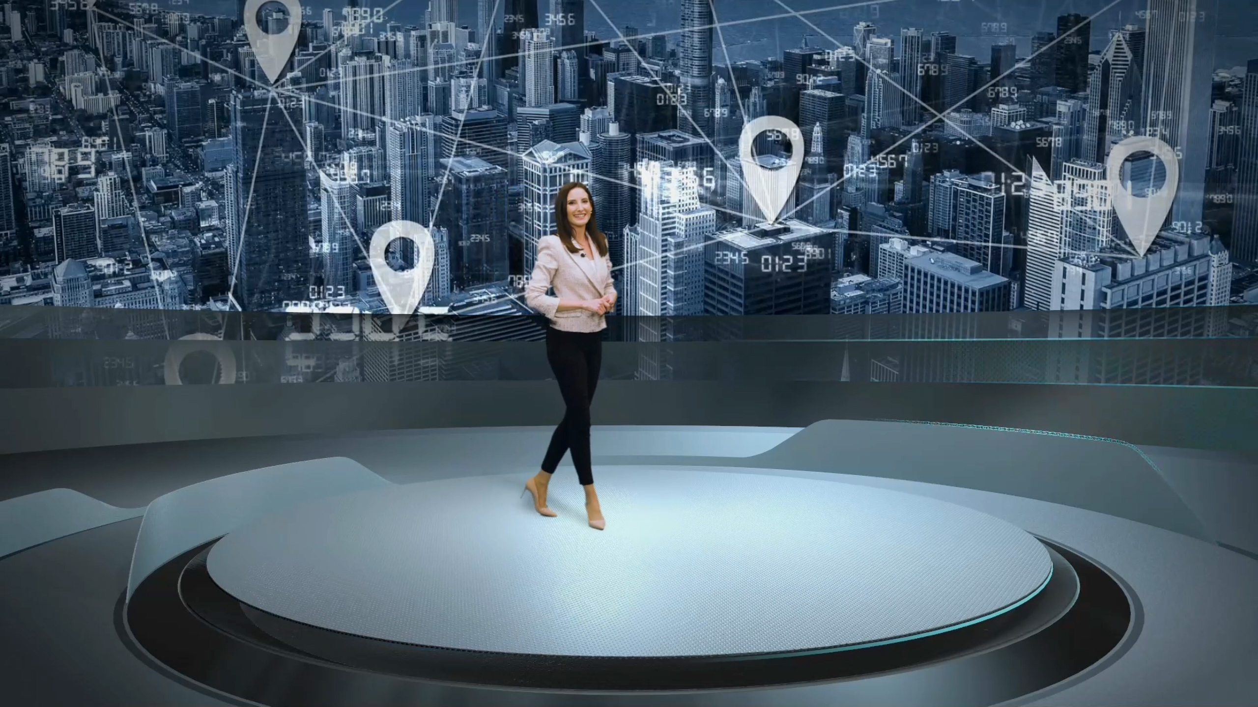 Una interfaz 3D para la producción de eventos virtuales y presentaciones corporativas, con conexiones en remoto de ponentes para una emisión en streaming con look televisivo.